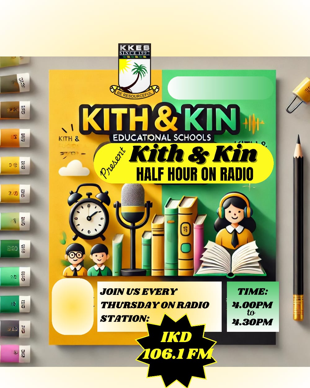 Established in 1997, Kith & Kin Educational Schools (KKES) mission is to inspire critical thinking and unleash the talents of every KKES student through a balanced array of opportunities and motivated members of staff academic environment and well trained and motivated members of staff as KKES prepares them to succeed in an increasingly complex, competitive and technologically driven global economy.